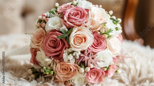 A white furniture displays a bridal bouquet of pink and white blooms against a wooden chair backdrop