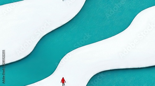 An aerial view of a person skiing down a snow-covered hill in the middle of a lake