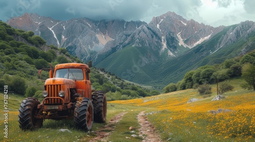 An orange tractor sits on a dirt road in front of a green field with yellow flowers and a mountain range in the background