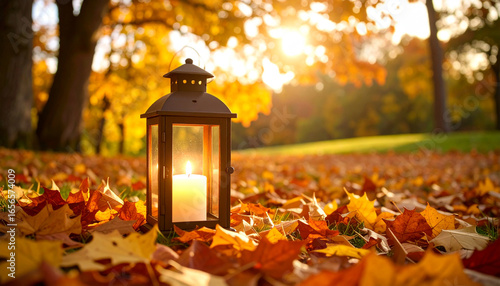 秋の落ち葉に囲まれたランタンの灯火 – Candlelight in a Lantern Surrounded by Autumn Leaves