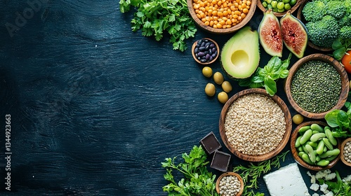 Fresh produce array on blue background with text space