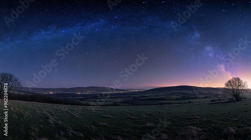 Night sky full of stars over grassy field with a tree in the foreground