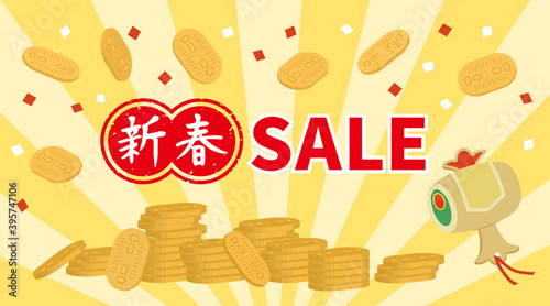たくさんの小判 打ち出の小槌と紙吹雪 お正月の明るいイメージ(新春SALE 文字入り)