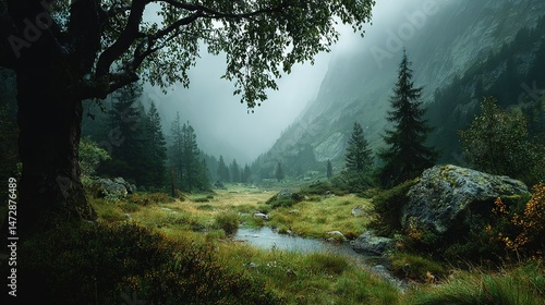 Stream flows through forest's lush green landscape, with numerous trees and misty hillside