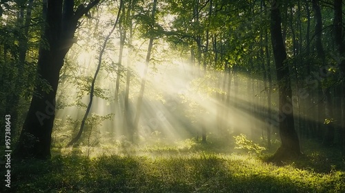 Sunlight filters through green trees, casting shadows on tall leaves in a forest landscape