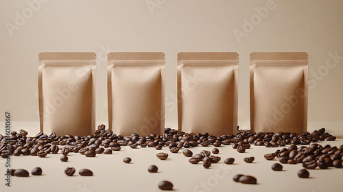 Three bags of coffee beans sit atop a table beside a mound of coffee beans