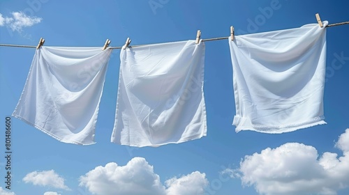 Three white towels hang on a clothesline against a blue backdrop Foreground features clouds