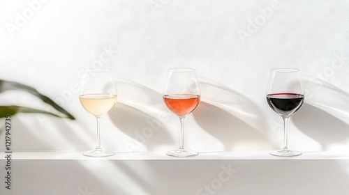 Three wine glasses arranged in a row on a white background with a plant in the foreground