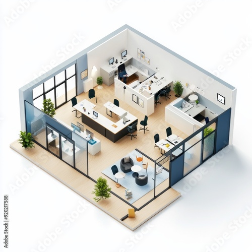 3D Render of a co-working space with shared desks, private offices, and collaborative zones. Miniature, on isolated white background
