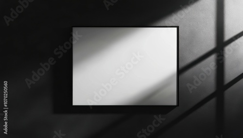 3D rendering of a white, blank TV screen mockup hanging on a dark wall background with a shadow.