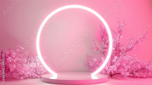 a 3D rendering of a neon podium designed for cosmetics aimed at teenagers, set against a pink background.