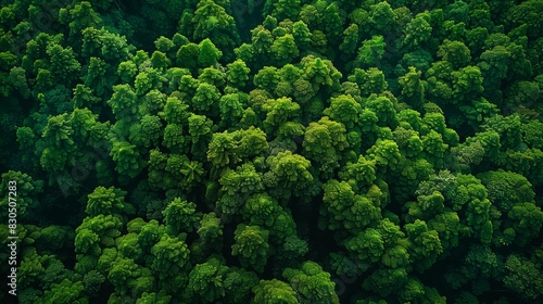 A bird's-eye perspective of a dense, green forest Trees populate the foreground, while their canopies form a sea of greenery in the background
