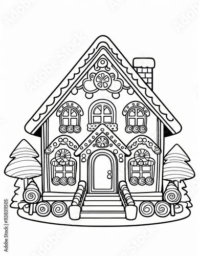 a black and white illustration of a gingerbread house. The house has a steep, triangular roof with decorative patterns resembling icing. There are two symmetrical windows on the upper floor