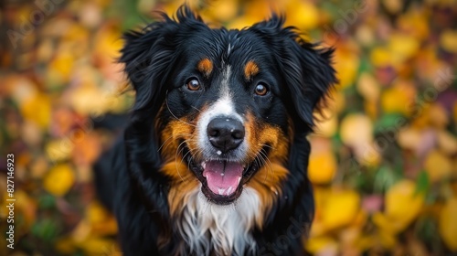 A black, brown, and white dog stands in front of a pile of yellow and red leaves with its mouth open and tongue out