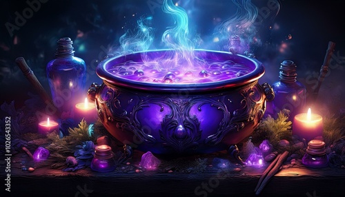 A bubbling cauldron filled with vibrant purple liquid, glowing softly with eerie green fumes