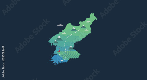 A circular, stylized map of South Korea, with lines indicating movement, and dotted pathways representing connections or transportation routes.