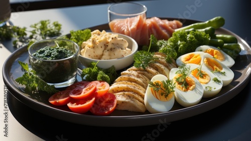 a close up of a plate of food with eggs, tomatoes, broccoli, carrots and other foods.