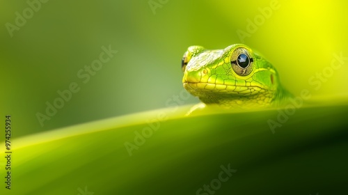 A close-up of a green frog on a leaf with a blurred background