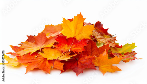 A collection of colorful leaves, ranging from reds and oranges to yellows and browns, set on a white background
