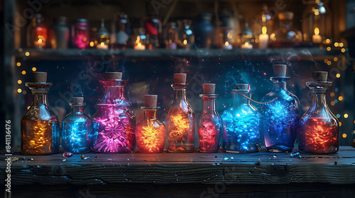 A collection of eerie, glowing potions on a wooden shelf in a dark room.