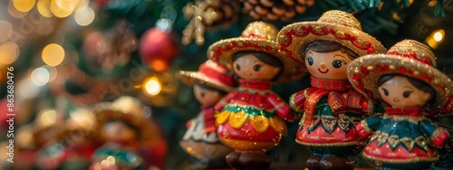 A collection of figurines atop a table, nearby a Christmas tree adorned with twinkling lights