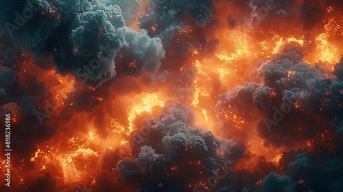 A collection of orange and black clouds in the sky, surrounded by a blue section in the middle, and a red hue in the heart of the image