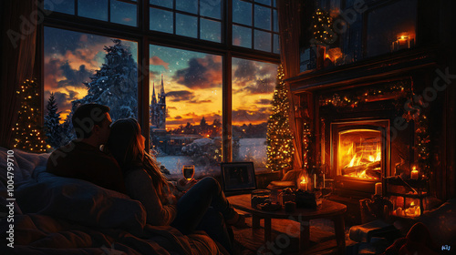 A couple enjoying a cozy evening by the fireplace.