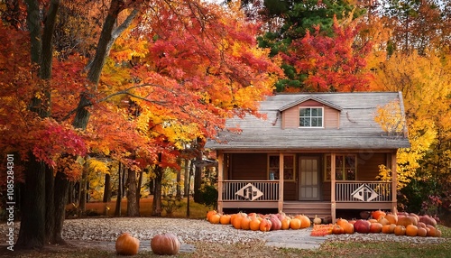 A cozy cabin is surrounded by vibrant autumn hues, featuring a porch decorated with pum_1(42)