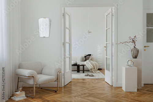 A cozy corner with a plush sofa, abstract artwork, and sculptural decor, capturing the essence of modern minimalism with a soft, inviting atmosphere...