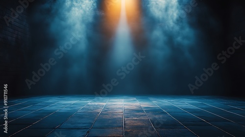 A dark room with a concrete floor and a spotlight. Suitable for dramatic or mysterious themed designs, theater and event promotion, and creative storytelling visuals. empty dark blue room