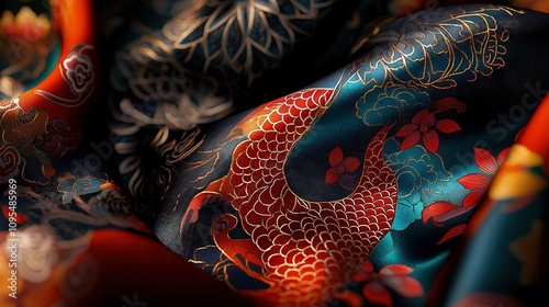 A detailed image of a dragon design in shades of red, blue, and yellow against a black backdrop with hints of orange and yellow