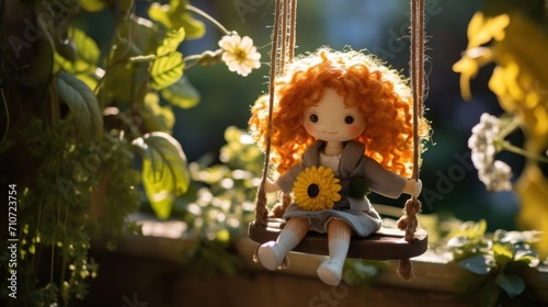 a doll is sitting on a swing with a sunflower in her hand and a flower in her other hand.