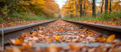 A forested train track, leaves of gold and orange beneath trees