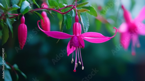 A fuchsia with pink flowers suspended from its green-leafed stems against a hazy backdrop