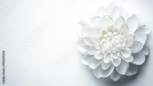 A giant white blossom resting atop a pristine white surface near a monochromatic timepiece hanging from a wall