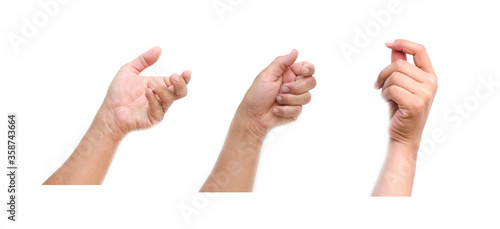 a hand holding something like a bottle or smartphone on white backgrounds, isolated