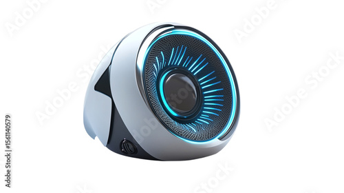 • A high-tech portable speaker with a futuristic design, isolated on white background in HD