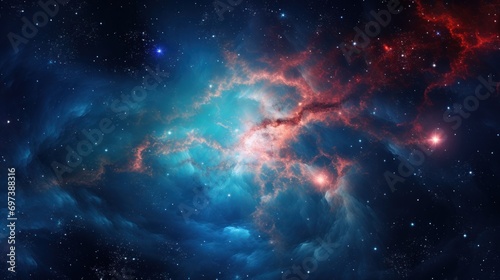 a large cluster of stars in the middle of a space filled with blue, red and white clouds and stars.