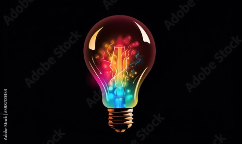 a light bulb with a colorful light inside of it on a black background. generative ai