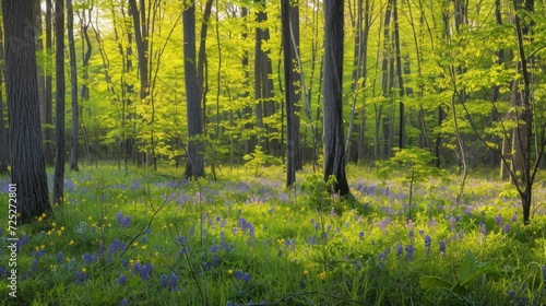 a lush green forest filled with lots of trees and blue and yellow flowers in the middle of a lush green forest filled with lots of trees and blue and yellow flowers in the middle.