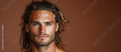 A man with long hair, braided atop his head, gazes seriously into the camera