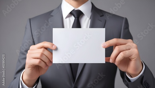 A middle-aged Caucasian man in a dark suit and tie holding a blank white card