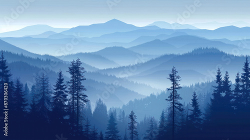 a misty mountain landscape at dawn. The scene features layers of distant, blue-hued mountains and silhouettes of pine trees in the foreground