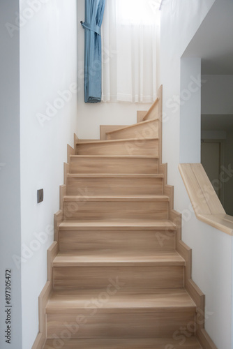 A modern, light-toned wooden staircase inside a contemporary home