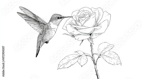A monochromatic illustration depicts a hummingbird in flight beside a rose, with outstretched wings, while a bloom appears in the foreground