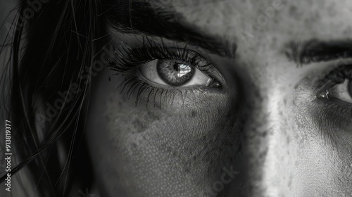 A monochrome image of a woman's face featuring freckled eyelashes and hair