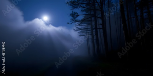 A moonlit forest path with dense fog rolling over the ground, casting soft shadows from towering trees