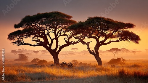 A pair of trees in a field during sunset with fog surrounding them