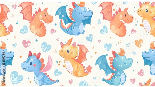 a pattern of cute cartoon dragons, winged hearts with loads, enchanted anime designs, charming anime characters