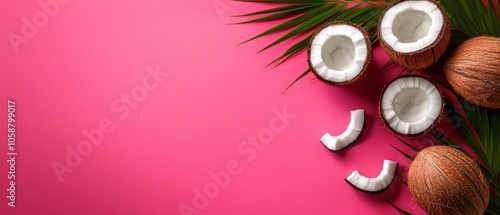 A pink backdrop adorned with coconuts; one whole and the other half, atop it